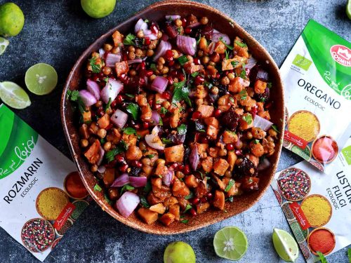 Presară oregano din gama Bio de la Cosmin, pune rozmarin doar peste cartofi și adaugă fulgi de usturoi atât pe cartofi, cât și pe năut. Condimentează cu piper, apoi dă tava la cuptorul preîncălzit la 160°C și lasă la copt aproximativ 20–30 de minute.